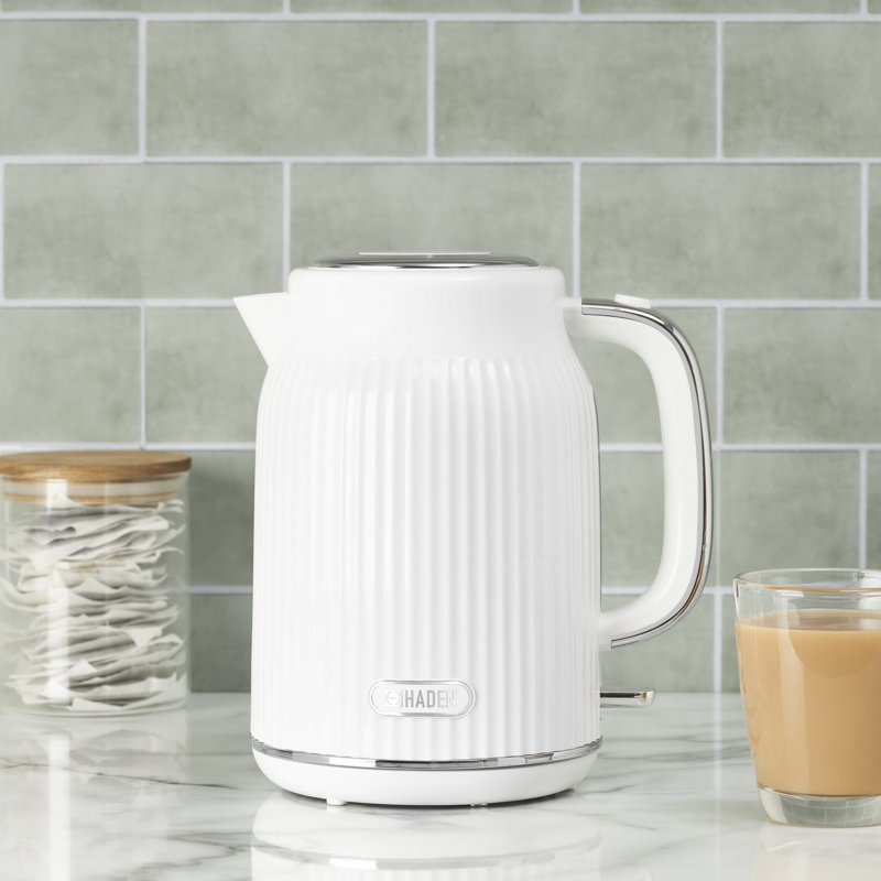 • With its stylish ridged design and shiny chrome details, this kettle is both chic and functional for your kitchen.
